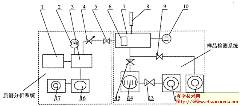 1. 四極質譜計;2. IRK251 冷規;3. 質譜室;4. 微調閥;5. 高真空閥;6. 被檢件;7. 檢測室;8. 標準漏孔;9. 旁抽閥;10. 電離規;11. 預抽泵;12. 前級泵1;13. 電磁閥;14. 渦輪分子泵1;15. 插板閥;16. 渦輪分子泵2;17. 前級泵。