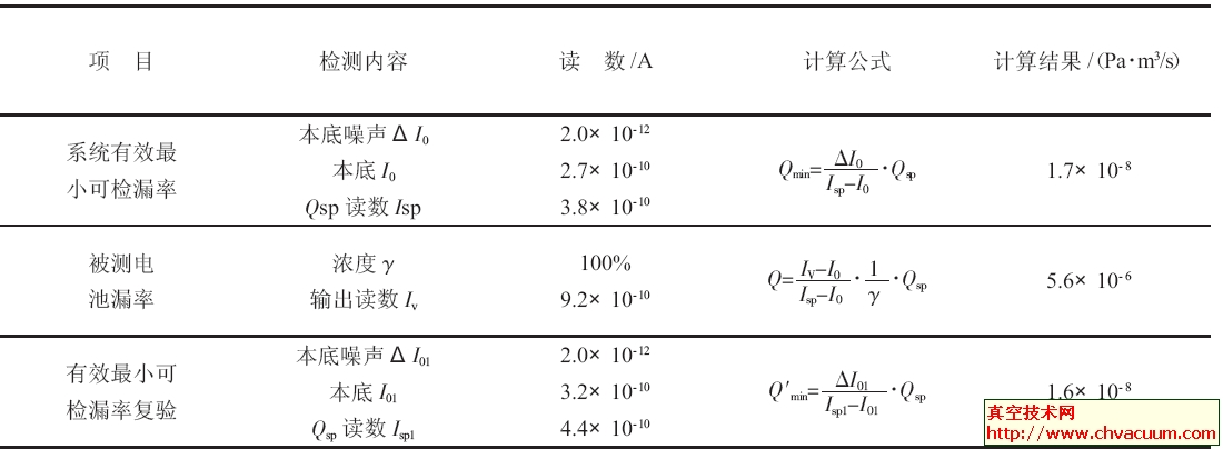 式中Qmin 為系統的有效最小可檢漏率,Pa·m3/s;ΔI0 為輸出指示本底噪聲值,A;Isp 為標準漏孔施氫后輸出指示值,A;I0 為標準漏孔未施氫時輸出指示的本底值,A;Qsp 為標準漏孔標稱值,本例中對氫的標稱漏率值為9.42×10-7 Pa·m3/s。測得的有效最小可檢漏率Qmin 必須滿足檢測要求。