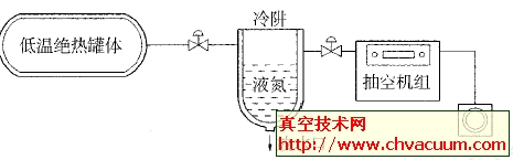 (2) 上述充氮氣、加溫及抽空過程一般不少于8~10次。在抽空過程中, 溫度要保持恒定, 在抽空機組與罐體之間應安裝冷阱(如圖1所示), 且保證冷阱內有液氮。充氮、加溫時應取下冷阱除霜, 并使其保持干燥。
