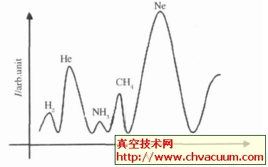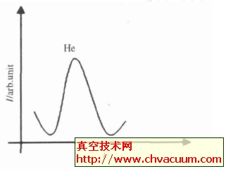 式中, R為離子偏轉軌道半徑; B為磁場強度; M/Z為離子的質量與電荷之比; U 為離子的加速電壓。由此可見,當R, B為固定值時,改變加速電壓,可使不同質量的離子通過磁場和接收縫到達接收極而被檢測到。如果電離室內的成分是干燥大氣,在圖1的出口縫處測得的離子流強度的理論峰值如圖2(根據干燥大氣成分繪制) 所示,圖中峰值的高度代表離子流強度,它與氣體在電離室的分壓成正比;氦質譜檢漏儀就是利用這一原理,實際上把加速電壓設在氦峰值上,如圖3 所示,接收極在擋板的作用下只能接收到氦離子,氦離子電流經過放大后用作指示漏率。