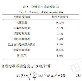 該裝置的標準總不確定度, 取k=2得到該裝置對 2×10-6Pa·m3/s標準漏孔的總不確定度為U95=2u(Q)=4%。并且從表2可以看出, 對于漏率大于 2×10-6Pa·m3/s 標準漏孔,漏、放氣和溫度波動引起的誤差都相對小, 從而可以降低總不確定度。