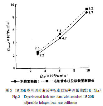 我們對大量的通道型標準漏孔進行了重復性測試,完全驗證了裝置的校準能力, 例如對LS-20B型可調鹵素漏率標準器在不同的漏率點測試, 測量誤差完全符合線性關系, 另外同毛細管水柱位移裝置測得數據誤差不超過15%, 見圖2所示。