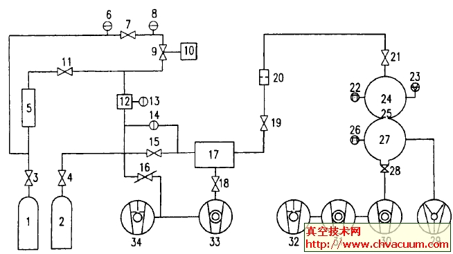 1、2. 氣瓶; 3、4、7、11、15、19、21. 截止閥; 5. 待校漏孔; 6、8、13. 絕對式電容規; 9. 三通閥; 10. 標準容積; 12. 定容室É ; 14. 差壓式電容規; 16. 針閥; 17. 定容室Ê ; 18、28. 插板閥; 20. 小孔; 22、26. 冷陰極規; 23. 四極質譜計; 24. 質譜分析室; 25. 限流孔; 27. 抽氣室; 29. 抽氣室; 29. 濺射離子泵; 30、31、33. 分子泵; 32、34. 機械泵。