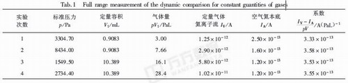 在全量程校準實驗中,由于沒有合適的漏孔,采取配制不同氣體量的標準氣體,模擬不同漏率的漏孔累積氣體量進行全量程校準實驗。在3~30PaL 內,選取了4點,測量了不同氣體量對應的離子流和離子流與氣體量的比值,如表1所示。