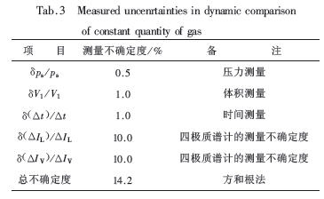 根據實驗測量結果和不確定度的分析,標準壓力pa用690型電容薄膜規測量,測量不確定度為0.5%。定量容積測量不確定度小于1.0%。時間用計算機的內部時鐘測量,考慮到開關閥門所用的時間,不確定度小于1.0%。質譜室中的示漏氣體分壓力用四極質譜計測量,不確定度約為10%。表3列出了定量氣體動態比較法的測量不確定度估計值,采用方和根法對各分項不確定度進行合成,總不確定度為14.2%。