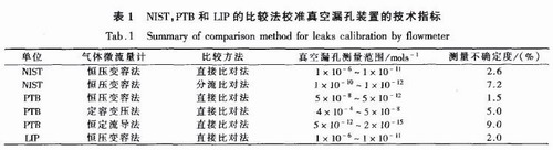 此方法中,關鍵技術之一在于氣體微流量計。表1是美國標準技術研究院(NIST)、德國物理技術研究院(PTB)和中國LIP的比較法校準真空漏孔裝置的技術指標。