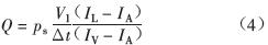 四極質(zhì)譜計(jì)實(shí)際測量的是示漏氣體的分壓力所對應(yīng)的離子流。設(shè)累積氣體中的示漏氣體所對應(yīng)的離子流為1L,定量氣體中的示漏氣體所對應(yīng)的離子流為IV。如果考慮到空氣中含有的示漏氣體成分和示漏氣體對正壓漏孔校準(zhǔn)系統(tǒng)的污染,用累積室配制一個(gè)大氣壓的空氣樣品,膨脹到10L 的定容室Ⅱ中,通過分子流動(dòng)態(tài)進(jìn)樣引入到質(zhì)譜室中,用四極質(zhì)譜計(jì)測量對應(yīng)于示漏氣體的離子流為IA,由式(2)可得實(shí)際的漏率計(jì)算公式如下: