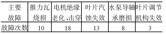 調(diào)查某省59座大型泵站運(yùn)行情況,發(fā)生過重要問題和事故的泵站共有14座(其中部分泵站的水泵葉片可調(diào)節(jié)) ,機(jī)組出現(xiàn)問題的部件及機(jī)構(gòu)主要為推力瓦、電機(jī)絕緣、葉片、導(dǎo)軸承和葉片調(diào)節(jié)機(jī)構(gòu),粗略統(tǒng)計(jì)10年內(nèi)各部件故障發(fā)生的次數(shù)如表1。水泵機(jī)組其他的常見故障,因其影響程度和維修難度小,維修費(fèi)用低,一般可以采用事后維修。