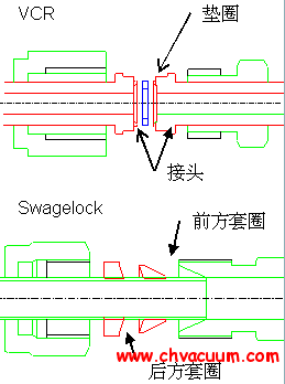 VCR通過雌雄兩個螺釘和金屬墊圈封止真空。Swagelock封止真空通過