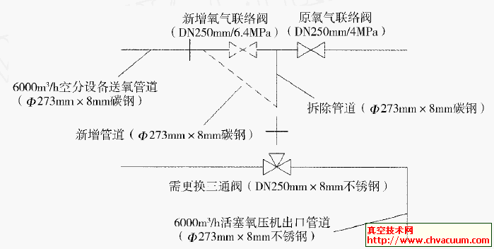 介紹6000m3/ h 空分設備與3 套21000m3/ h 空分設備的氧氣管道聯網后, 出現的氧氣專用截止閥關閉不嚴以及氧氣放散閥根部開裂現象, 詳細敘述新增1 個氧氣專用截止閥以及部分改造氧壓機出口管道的過程, 排除了氧氣泄漏