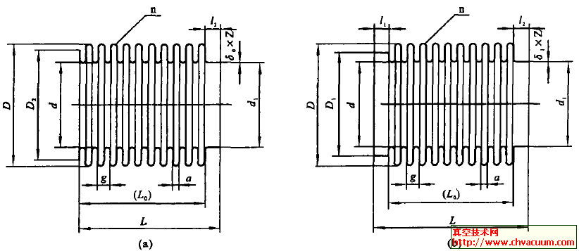 圖中D———波紋管外徑 d ———波紋管內徑 a ———波厚 q ———波距 n ———波紋數 δ0 ———單層壁厚,波紋管管坯的單層壁厚 Z ———層數 d1 ———端部外配合直徑 D1 ———端部內配合直徑 D2 ———沿波峰切邊直徑 l 1 ———端部內配合長度 l 2 ———端部外配合長度 L ———波紋管總長 L 0 ———波紋管有效長度(a) 常用結構1 (b) 常用結構2
