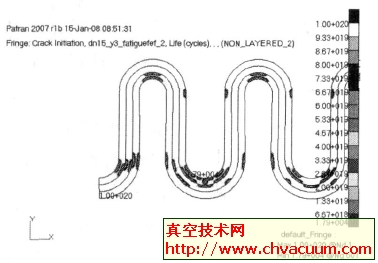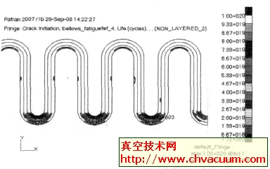 通過金屬波紋管疲勞壽命試驗,并通過以上兩種試驗與軟件分析的對比,驗證了波紋管波谷處出現(xiàn)了裂紋,其他位置未發(fā)生損壞。另外,通過對比不斷改進和提高軟件分析的準確度,提高金屬波紋管的設計、制造水平,縮短產(chǎn)品的開發(fā)周期。