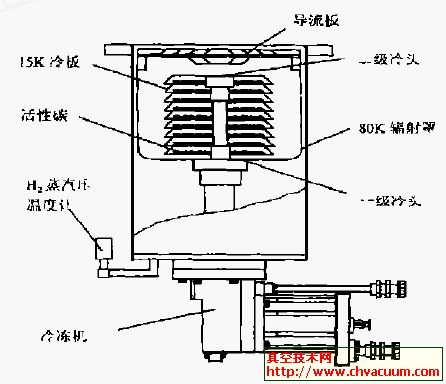 主要用來(lái)凝縮排除水蒸氣(H2O)、有機(jī)物(CO2) 等的氣體分子, 并用來(lái)防止熱輻射直接進(jìn)入輻射罩。通常, 在80K溫度下,入射水分子的溫度即使在室溫, 凝縮系數(shù)也接近于1。因此, 水分子幾乎全部被凝縮, 所以, 冷凝泵對(duì)水的排除是最理想的。