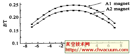 為了提高微型濺射離子泵的性能,設計了多種磁場源。圖5是其中兩種磁場源磁場強度的空間分布;圖6 是小離子泵分別工作在兩種磁場源下的抽速曲線圖。