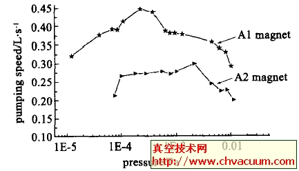 按照上文所述方法,用A1型磁鋼,并用配套電源進行測試。用高純氮氣為抽速測試氣體。每個數量級測量三個穩定點。