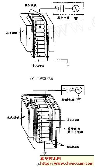 鈦泵有兩種結構: 二極泵和三極泵如圖1所示。圖1(a)是二極鈦泵, 它用永久磁鐵產生強度為0.1~0.3 特斯拉的軸向磁場,陽極由許多厚0.1~0.3mm、直徑12~40mm 的不銹鋼薄壁圓筒組成,陽極兩端為1~3mm 厚鈦陰極, 兩極之間加上3~7kV 電壓, 產生強電場。電場將兩個陰極間的電子拉向陽極, 在向陽極中心線運動時,速度越來越快,穿過中心線后,受到另一邊陰極的斥力作用, 開始減速運動, 快到陰極時,速度變為零而反轉。電子多次重復上述運動,經過很長時間后才落到陽極上。軸向磁場使電子作圓周運動, 阻止電子直接快速飛向陽極。電磁場總的作用效果使電子以螺旋線運動的形式貼近陽極, 在陽極周圍形成一層電子云, 增加電子與殘余氣體碰撞產生電離的機會。電子在真空中從某次與殘余氣體碰撞到下次碰撞之間所經過的平均路程稱為平均自由路程。在10 - 6乇真空時平均自由路程約為285 米。而在鈦泵中平均自由路程大大縮短了。圖1 (b) 是三極鈦泵,它是在二極鈦泵陰極前面增加了泵壁, 形成第三個電極,泵壁與陽極等電位, 離子濺射鈦原子到泵壁上, 這種斜射比二極泵濺射出更多的鈦原子。