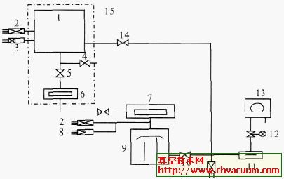 1.真空室2.熱偶真空計3.B-A真空計4.放氣閥5.超高真空閥6,7.冷阱8.電離真空計9.擴散泵10.前級管道閥11.前級阱12.電磁閥13.機械泵14.超高真空管道閥15.烘烤裝置