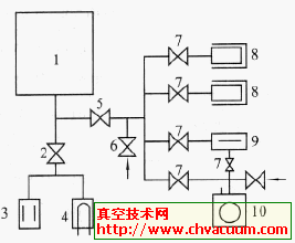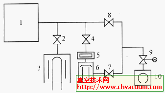 1.真空室 2.超高真空閘閥 3.濺射離子泵-鈦升華泵組 4.超高真空閘閥 5.冷阱 6.擴散泵 7.前級管道閥 8.超高真空管道閥 9.放氣閥 10.機械真空泵