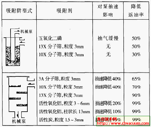 在真空系統(tǒng)的前級(jí)管路上設(shè)置吸附阱,用吸附劑捕獲機(jī)械泵的返流油蒸氣,是防止機(jī)械泵油污染真空系統(tǒng)的簡便方法。吸附劑靠物理吸附或化學(xué)吸附捕獲油蒸汽分子。常用的吸附劑有:五氧化二磷、分子篩、活性氧化鋁、活性碳等,各種吸附劑的擋油效果見表2。