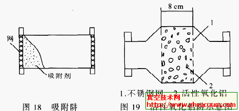 圖18所示的吸附阱:在一根圓柱管(Φ50×125mm)的兩端加固定網(wǎng),管中放置吸附劑。圖19是一個(gè)實(shí)用活性氧化鋁阱,阱內(nèi)放置Φ3~Φ10mm 的球狀吸附劑,擋油率可達(dá)99%,主要應(yīng)用在抽氣系統(tǒng)的前級(jí)管道上。阱吸收水汽后,可在真空中加熱300℃后保持1~2h進(jìn)行再生;為避免水汽凝結(jié)在管道壁上,管道應(yīng)加溫至150℃或從上游充入少量氣體。最好是在真空系統(tǒng)外的大氣下加熱至300℃烘烤1~2h,然后趁熱(高于100℃)把氧化鋁倒入阱內(nèi),隨即與大氣隔離封閉。將活性金屬吸附劑(例如鎳)化學(xué)沉積在氧化鋁上,可以得到幾百m2/g的活性表面;當(dāng)用作前級(jí)吸附阱時(shí),提高吸附劑的溫度可以增加油蒸氣的化學(xué)吸附量而同時(shí)減少水汽的物理吸附量。試驗(yàn)表明,其性能優(yōu)于類似的活性氧化鋁阱。