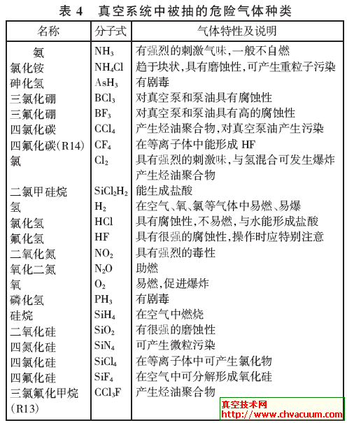 表4 中所列為一些典型的被抽除的危險氣體,腐蝕性氣體和反應生成物,當它們達到一定濃度時是危險的,在處理和抽除時必須特別小心。