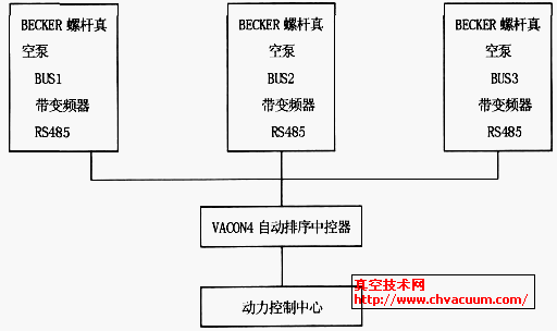 采用BECKER 配套的VACON4 排序中控器控制,控制邏輯見圖3,采用RS485 通訊協議與動力控制中心實現數據交換,VACON4 排序控制器可以滿足最少1 臺最大22 臺設備負荷無級控制,完全可以適應卷煙企業集中群控的控制要求。