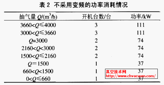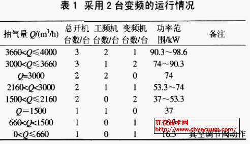 通過比較,可以很清晰地看到,采用2 臺變頻的方案不僅可以滿足在總負荷范圍的無級調節,實現負壓的穩定供應,相比與不變頻的方案,能夠實現節能運行的目的。