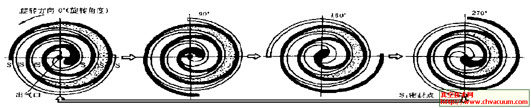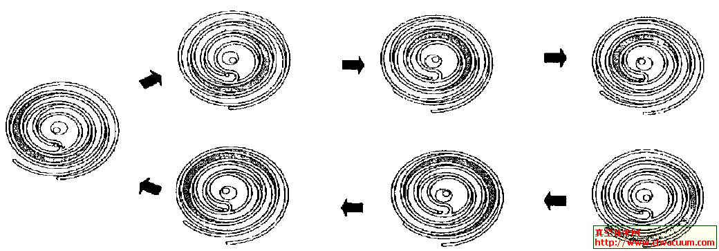 渦旋型干式真空泵以其轉動方式不同,分為兩種型式:一種是一個渦旋固定不動(稱為靜渦旋),另一個渦旋圍繞著它公轉平動而不能自轉(稱為動渦旋)的公轉型(Orbiting type);另一種是兩個渦旋同步同方向各自繞自身軸轉動的回轉型(Rotat ingtype)它的兩個渦旋都是動渦旋。