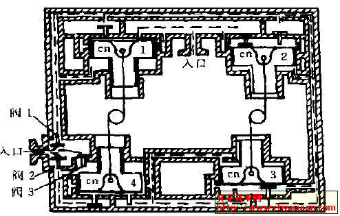回轉(zhuǎn)型機構(gòu)最大的優(yōu)點,是非接觸式的,能夠高速運轉(zhuǎn),可得到較高的抽速。但作為干式泵而言, 非接觸式轉(zhuǎn)子的冷卻是困難的。然而對于往復(fù)式活塞泵來說,活塞和氣缸的外表面都能和周圍大氣接觸,很容易被大氣對流散熱, 而驅(qū)動機構(gòu)也處在大氣之中,有利于散熱。目前有多級干式活塞泵(VRC型)串、并聯(lián)工作,極限壓力3~93Pa,抽速140~280L/m in。四級的往復(fù)式活塞泵,其結(jié)構(gòu)布置如圖9所示。