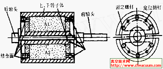 轉(zhuǎn)子部件的結(jié)構(gòu)如圖2,從結(jié)構(gòu)圖可看出,它是由上下空心轉(zhuǎn)子體和前后軸頭通過銷釘定位、螺釘緊固組裝后進行精加工而成。組裝好的轉(zhuǎn)子部件, 形成了由空心轉(zhuǎn)子體與前后軸頭組成的兩個封閉空間A1、A2,它們在轉(zhuǎn)子部件進入泵腔運行前,一直處于1個大氣壓狀態(tài)(所含物質(zhì)主要是空氣、組裝的加工液等)。當(dāng)裝配好后進行運行調(diào)試時,如果轉(zhuǎn)子體與軸頭的結(jié)合面不滲漏的話,不管泵腔里的真空度如何,它將一直處于1個大氣壓狀態(tài)。但是, 如果結(jié)合面有滲漏, 則A1、A2里的氣體將沿結(jié)合面間隙漏入泵腔。