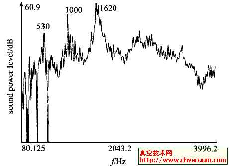 由羅茨真空泵的噪聲源排隊測試分析可知,泵體的聲輻射對羅茨泵總噪聲貢獻最大。泵體的噪聲主要是由泵體封閉外殼的聲輻射所引起,530,1000,和1620Hz 是其聲輻射的優勢頻率,見圖3,因此這三個頻率產生輻射的原因和部位是研究的關鍵問題。