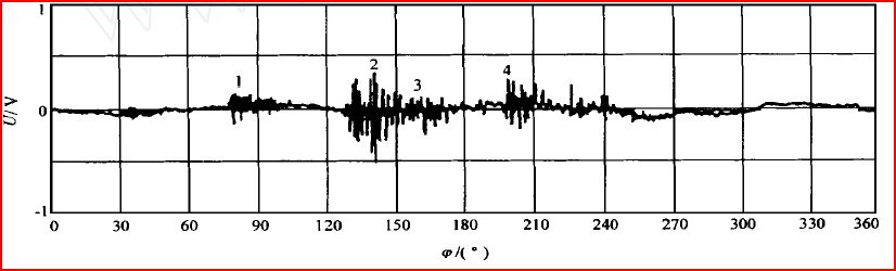 圖2 是滑閥真空泵在抽氣達(dá)到極限壓力(615 ×10 - 1 Pa) 時,在排氣口處測得的一個運動周期內(nèi)的振動波形。圖中橫座標(biāo)上的角度與圖3 中滑閥轉(zhuǎn)子運動位置轉(zhuǎn)角φ相對應(yīng), 當(dāng)轉(zhuǎn)子在圖3 中下死點位置時,轉(zhuǎn)角φ= 0°。排氣口位于圖3 中A, B 兩點之間。在圖2 中的一個振動周期內(nèi),出現(xiàn)了四種主要沖