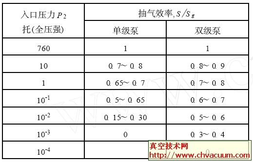 由此式得知, 實際抽速S 與幾何抽速Sg , 管道流導U 以及極限壓力P 0 和泵的入口壓力P 2 有關。當P 2> > P0時, P0/P2可以忽略, 實際抽速S 僅與Sg和U有關。當P 2→P0時則S →0。實際抽速S 是靠試驗求得的, 例如表1 列舉了抽氣效率與入口壓力的關系。