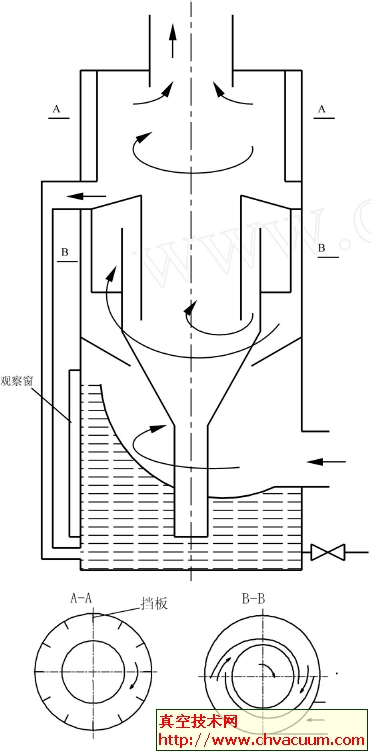 濕式羅茨泵也屬直排大氣羅茨泵,它的噪聲機(jī)理也與氣冷式羅茨泵相似,但因?yàn)樵诒萌肟趽饺肷倭克?故有一部分聲能被水吸收,因?yàn)橛?ldquo;聲波堆集”作用,故噪聲仍然很大。為了提高抽速和真空度,可以將兩臺(tái)濕式羅茨泵串聯(lián),不但可以降低功率消耗,噪聲也會(huì)有所降低。它工作特點(diǎn)也是在極限壓力下噪聲最大,并以中、低頻為主。由于濕式羅茨泵排出的氣體中含有少量的水,所以一般消聲器都無法使用。根據(jù)這種特殊情況,我們?cè)O(shè)計(jì)了消聲型氣水分離器,如圖7所示。