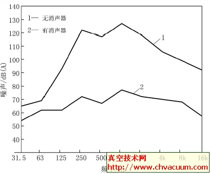在半導(dǎo)體、電子工業(yè)為代表的制造工藝中,迫切要求無污染的真空度較高的清潔真空,氣冷式羅茨泵正好滿足這個(gè)要求。但單級(jí)氣冷式羅茨泵真空度太低,必須多級(jí)串聯(lián)組成多級(jí)羅茨泵。多級(jí)羅茨泵的噪聲機(jī)理與氣冷式羅茨泵相似,但由于級(jí)數(shù)較多,一般為五級(jí)。每一級(jí)承受的壓差就小一些,發(fā)熱量也就少多了,再說多級(jí)羅茨泵抽速都不大,所以沒有必要再設(shè)置返冷氣裝置,因此多級(jí)羅茨泵只是使用了氣冷式羅茨泵的轉(zhuǎn)子型線。多級(jí)羅茨泵的工作特點(diǎn)也是極限壓力下噪聲最大,雖然一般多級(jí)羅茨泵的抽速都不大,但由于“聲波堆集”作用,泵的噪聲仍然較大,例如30L/s的多級(jí)羅茨泵噪聲達(dá)108dB(A),而且在所有頻率范圍內(nèi)都有較高的峰值。我們采用了縫隙式復(fù)合消聲器,使噪聲降低到65dB(A) ,具體消聲前后噪聲頻譜圖見圖6。