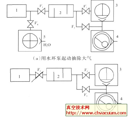 1. 被抽容器 2. 過濾器 3. 羅茨泵 4. 滑閥泵 5. 水環泵 V1~V4.閥門 V5.可調閥門