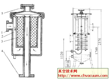 圖34所示為一種適用于油封機械真空泵入口處的機械阻擋式過濾除塵器,其工作原理為被抽氣體由除塵器入口1進入除塵器、外筒室2 相當于旋風分離器,大顆粒灰塵在此被分離并沉積于外筒室底部。較小的顆粒隨被抽氣體進入油浸過濾器。經過充分除塵的氣體由出口4或5進入真空泵。