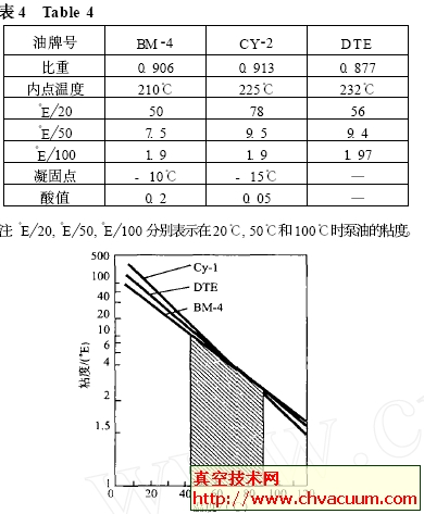 目前油封機械泵的泵油多為去掉最重和最輕餾分的透平機油。如BM 24DJE 和CY22 等。這些油在50℃時, 其粘度為7~ 10 °E (恩格列爾粘度以°E 表示)。泵油性能如表4 所示。