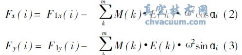 設(shè)i 時泵軸轉(zhuǎn)角為ai (0℃到360℃依次取值) , 長短缸的不平衡慣性力為F 1(i) , 滑閥泵X 、Y 方向的剩余慣性力Fx (i) 和Fy (i) 分別為