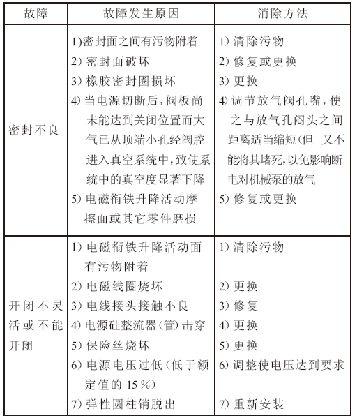 電磁壓差放氣閥是機械真空泵的入口專用閥門,其電源與機械泵的電源聯鎖,放氣閥置于泵入口管道中,其作用為:當泵斷電或控制開關斷開時,電磁閥動作,向泵入口放氣,并且靠大氣壓力自動關閉泵與真空室之間的管道。泵啟動時,電磁閥關閉,泵對閥腔內部抽空,然后閥板靠彈簧壓力打開,使被抽容器與機械泵進氣口接通。電磁放氣閥的常見故障及消除辦法如表8所示。