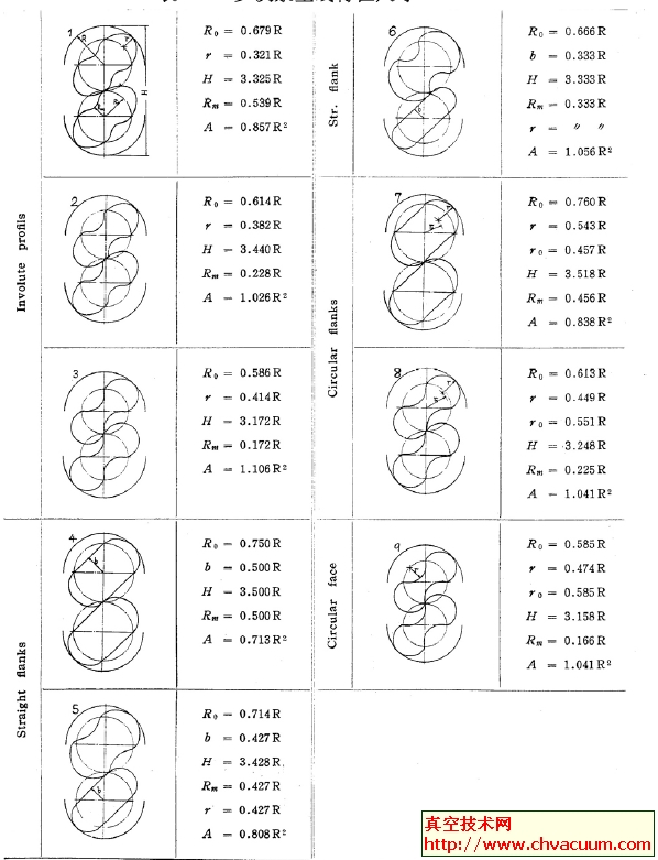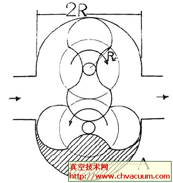 通常轉子的轉子的半徑R和轉子的長度L之比為0.25-0.50。若增加泵的理論抽速,可以增加n、L和A的值,通常n=1500-3000轉/分,故常用增加A值,即增加抽氣面積來增加抽速。A值與轉子的型線有一定的關系,如圖1所示。
