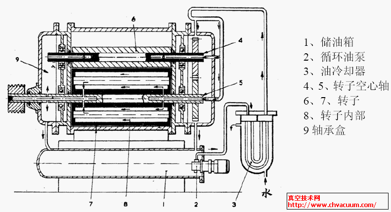 另一種方法是利用通過轉(zhuǎn)子內(nèi)部來冷卻轉(zhuǎn)子的方法,其原理如圖6所示,冷卻油也被用來潤滑軸承和齒輪,把循環(huán)的油封在系統(tǒng)內(nèi)。工作時,轉(zhuǎn)子的溫度往往比泵體低。隨著氣體負(fù)荷的增加,轉(zhuǎn)子和泵體之間的溫差也隨之增大,這樣一來,就可能引起泵內(nèi)間隙增大,而使抽速降低。為了避免這種情況的發(fā)生,以泵的負(fù)荷大小來調(diào)節(jié)循環(huán)油量的多少。在負(fù)荷特別大時,也可考慮對泵體進(jìn)行冷卻。以保持原始的間隙值。