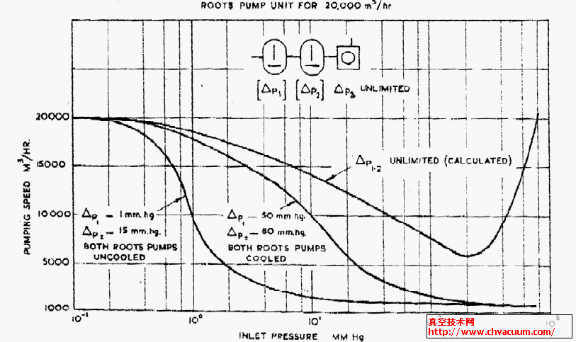 圖7 幾何抽速為200003m/h的羅茨泵機(jī)組、羅茨泵轉(zhuǎn)子的冷卻與否,對實際抽速的影響