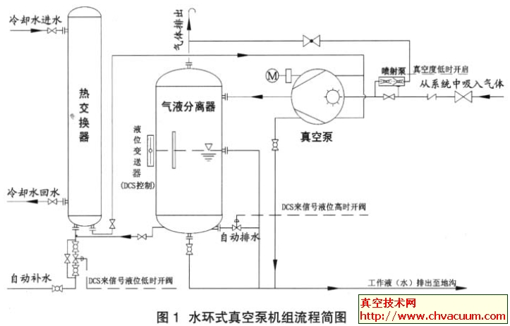 在具體生產(chǎn)運(yùn)用中,真空泵是以機(jī)組的形式使用的,主要由水環(huán)真空泵、電動(dòng)機(jī)、熱交換器、氣液分離器及氣、水管路和控制儀表元件等組成,有的還包括減速機(jī)。其流程簡(jiǎn)圖如圖1。