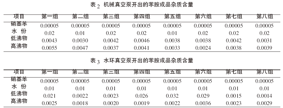 表2 和表3 數(shù)據(jù)分別為使用機(jī)械真空泵和SK 型水環(huán)真空泵給苯胺精制塔帶真空所蒸餾出的苯胺成品數(shù)據(jù)對(duì)比。從表2、表3 不難看出,使用水環(huán)真空泵開(kāi)出苯胺成品不僅水份低,而且低沸物和高沸物含量均有不同程度的下降,這滿足了高端客戶的需求,也為競(jìng)爭(zhēng)激烈的市場(chǎng)贏取了更為廣闊的生存和發(fā)展空間。