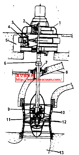 1.上機(jī)架 2.推力軸承 3.轉(zhuǎn)子 4.定子 5.風(fēng)道 6.聯(lián)軸囂 7.泵軸填料密封 8.出水流道 9.水票導(dǎo)軸承 10 導(dǎo)葉體 11.葉轉(zhuǎn) 12.葉轉(zhuǎn)外殼 13.進(jìn)水流道