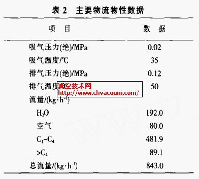 中國石油化工股份有限公司北京燕山分公司煉油廠簡稱燕化公司煉油廠新建8.0Mt/a常減壓蒸餾裝置減壓塔采用三級抽真空設計, 其中一、二級為高效噴射式蒸汽泵, 第三級為液環真空泵,為降低電網波動對裝置操作的影響, 第三級還并聯一組噴射式蒸汽泵作為備用抽真空設施。該裝置于2007年6月建成投產, 減壓塔塔頂真空度保持在1.6KPa絕以下, 且運行平穩。液環真空泵運行主要物流物性數據見表2。