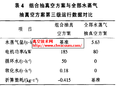 由表4可以看出, 采用組合抽真空系統比全部水蒸氣抽真空系統降低能耗0.415kg/t, 節能效果顯著。