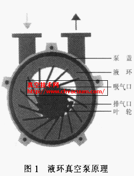 由于葉輪相對于旋轉液環是偏心的, 液體在葉片之間空間內往復運動, 對泵送介質產生抽吸和壓縮的作用。在吸氣階段, 液環逐漸遠離輪毅,將泵送介質沿軸向從吸氣口吸人在排氣階段, 液環逐漸逼近輪毅, 將泵送介質沿軸向從排氣口排出, 連續不斷地抽吸液體, 便達到抽真空的目的。