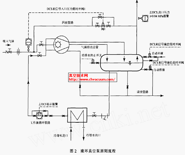 液環真空泵成套設備主要由液環真空泵、電機、冷卻器、氣水分離罐及氣、水管路及控制儀表元件等組成, 液環真空泵原則流程示意見圖2。